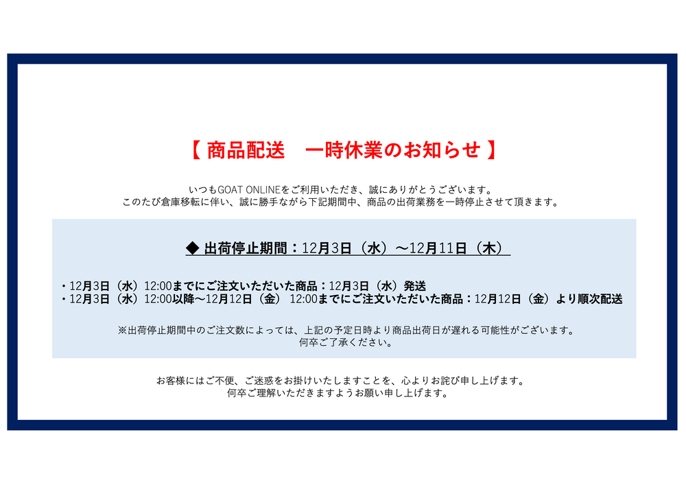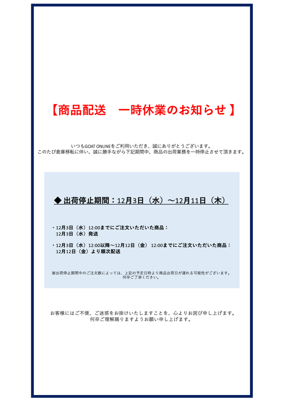 ■倉庫移管に伴う配送停止期間に関して平素はGOATに格別のお引き立てをいただき、誠にありがとうございます。倉庫移管に伴う配送停止期間についてお知らせいたします。 【配送停止期間】2025年12月3日(水)〜2025年12月11日(木) 【配送について】商品の注文が集中した際は、下記の予定日...